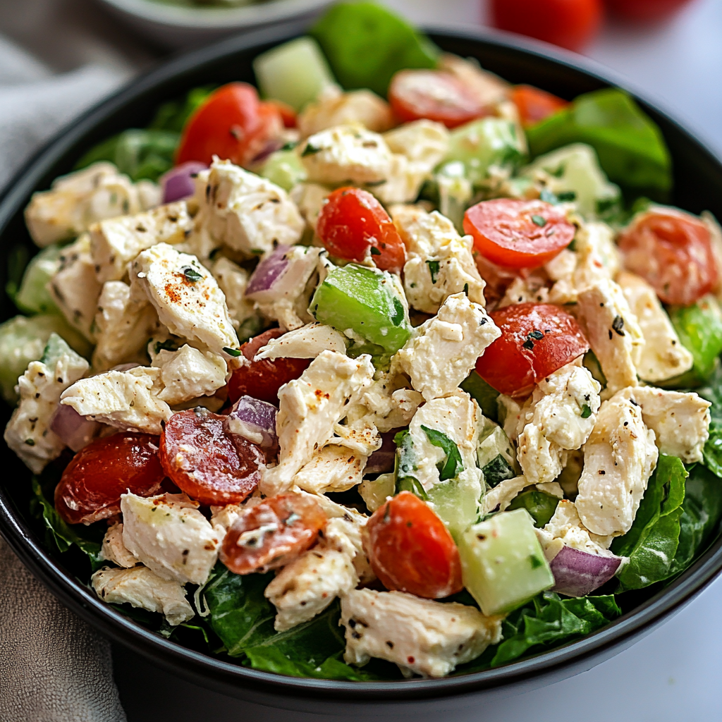 A refreshing and delicious salad bursting with flavors and textures featuring juicy grilled chicken, tangy feta cheese, crisp vegetables, and a zesty dressing.
